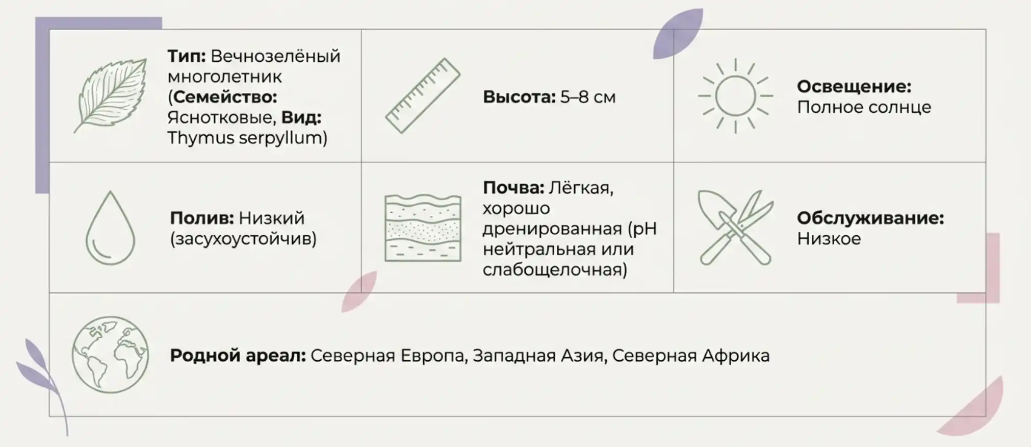 Тимьян ползучий — компактное, ароматное и очень благодарное растение. При минимальном уходе вы получаете:
