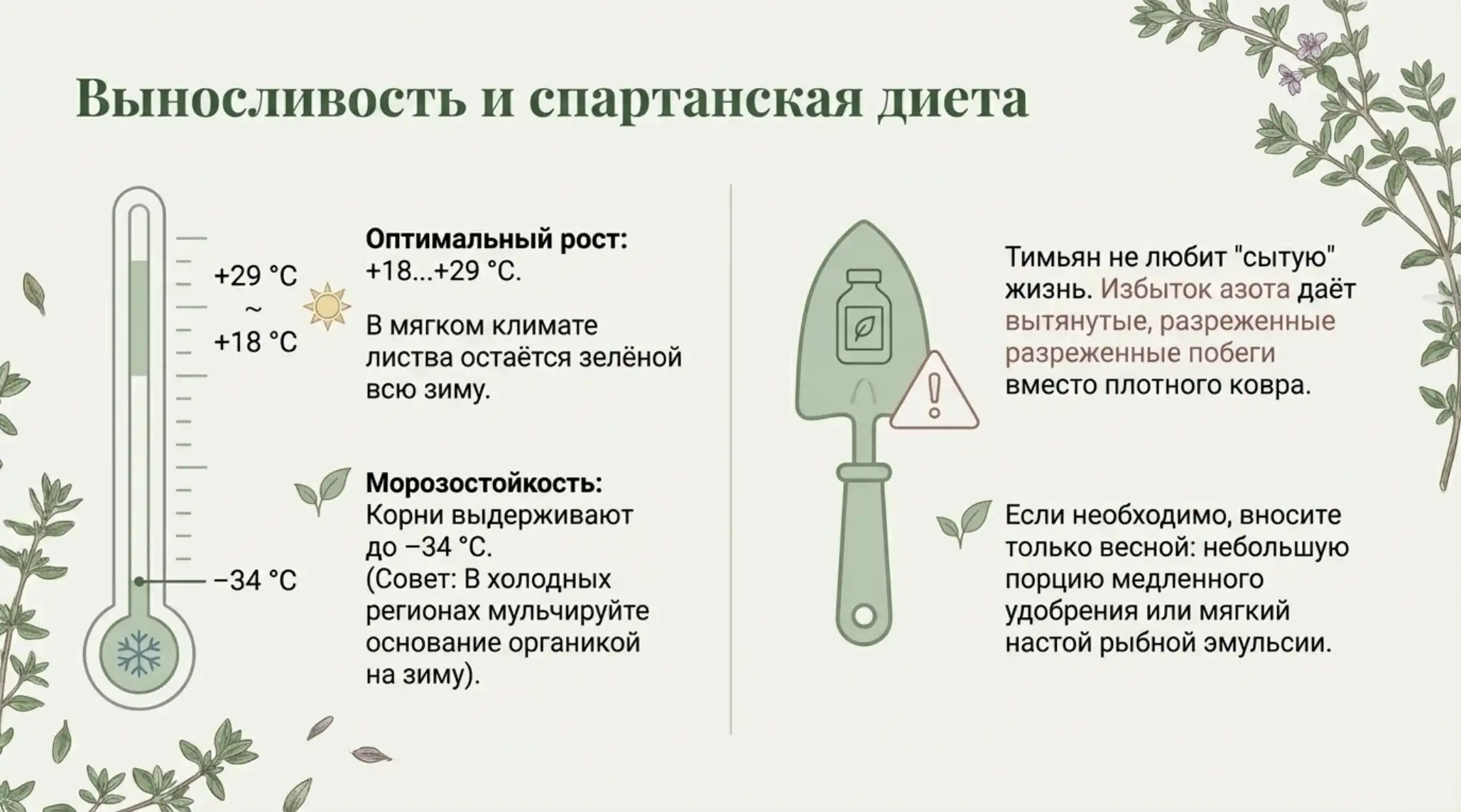 - Тимьян выдерживает как жару, так и морозы, до –34 °C по корням.