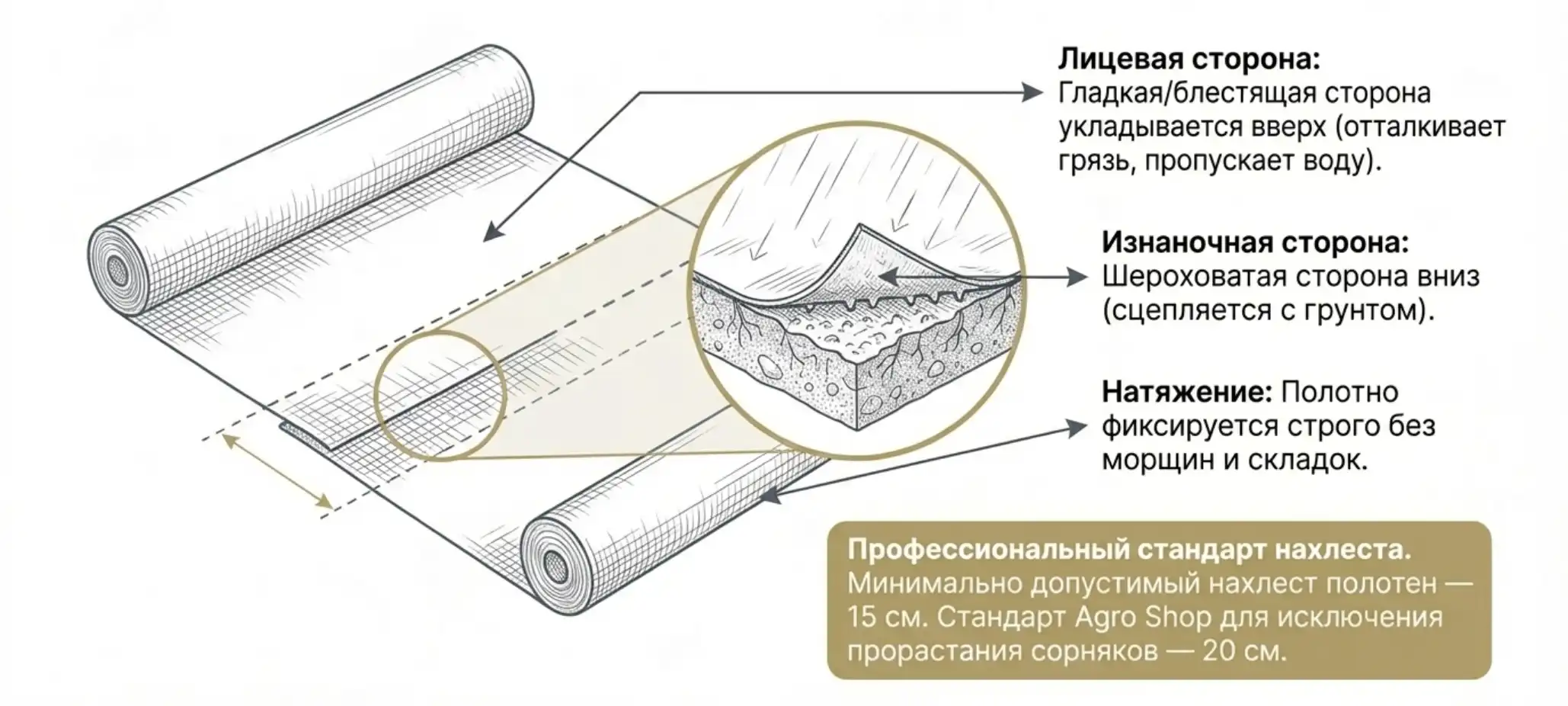 - При укладке нескольких полотен делайте нахлест. Экономия на ширине нахлеста — критическая ошибка, которая гарантированно приведет к прорастанию сорняков. Минимально допустимое значение — 15 см, но профессиональный стандарт — 20 см.