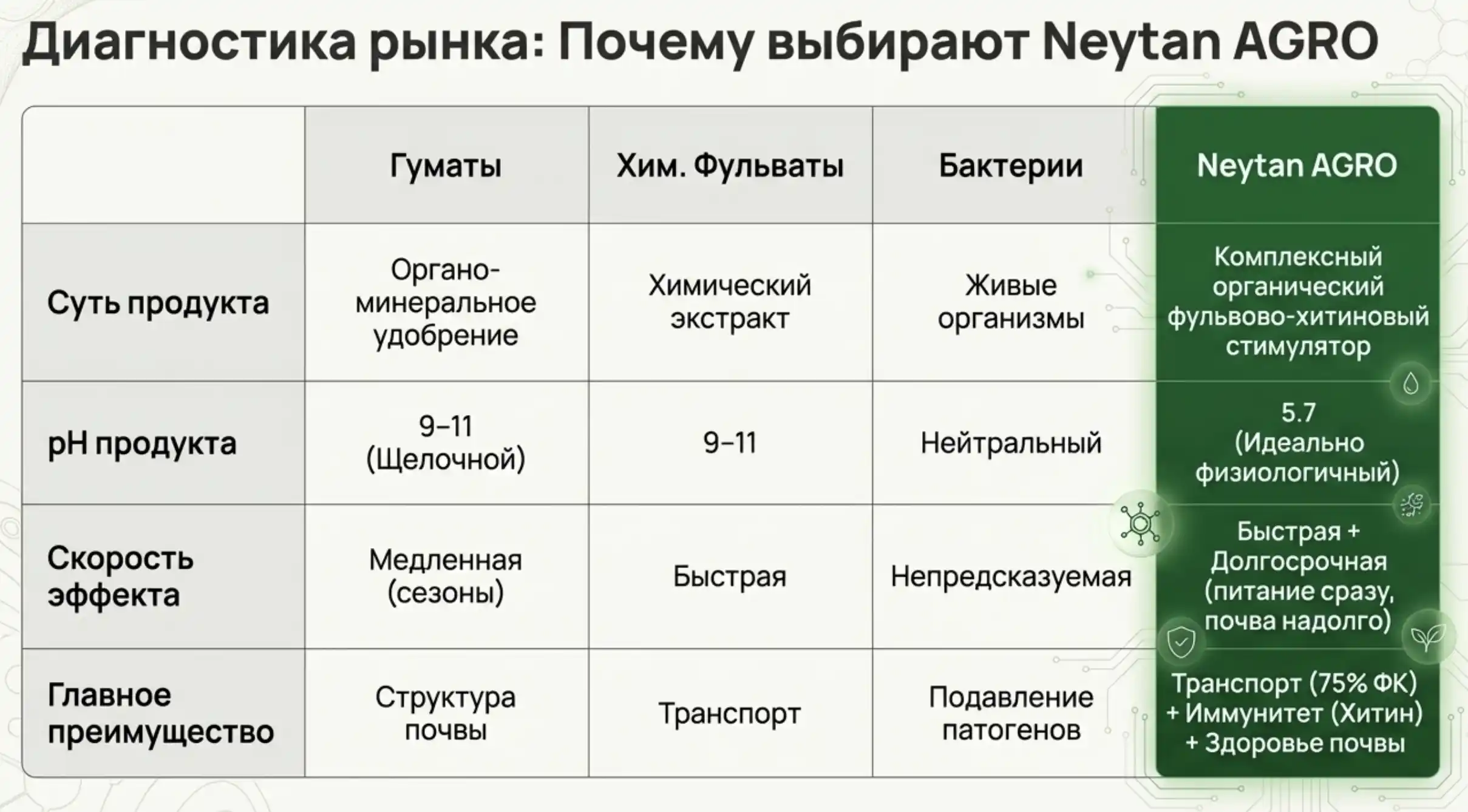 Мы постоянно следим за тем, что появляется на рынке агрохимии и органических препаратов. Не всё заслуживает отдельной публикации, но мимо препарата Neytan AGRO мы пройти не могли. Это биостимулятор на фульвокислотной основе, который сделан иначе, чем большинство аналогов, и при ближайшем рассмотрении оказывается куда интереснее, чем кажется по описанию на этикетке.