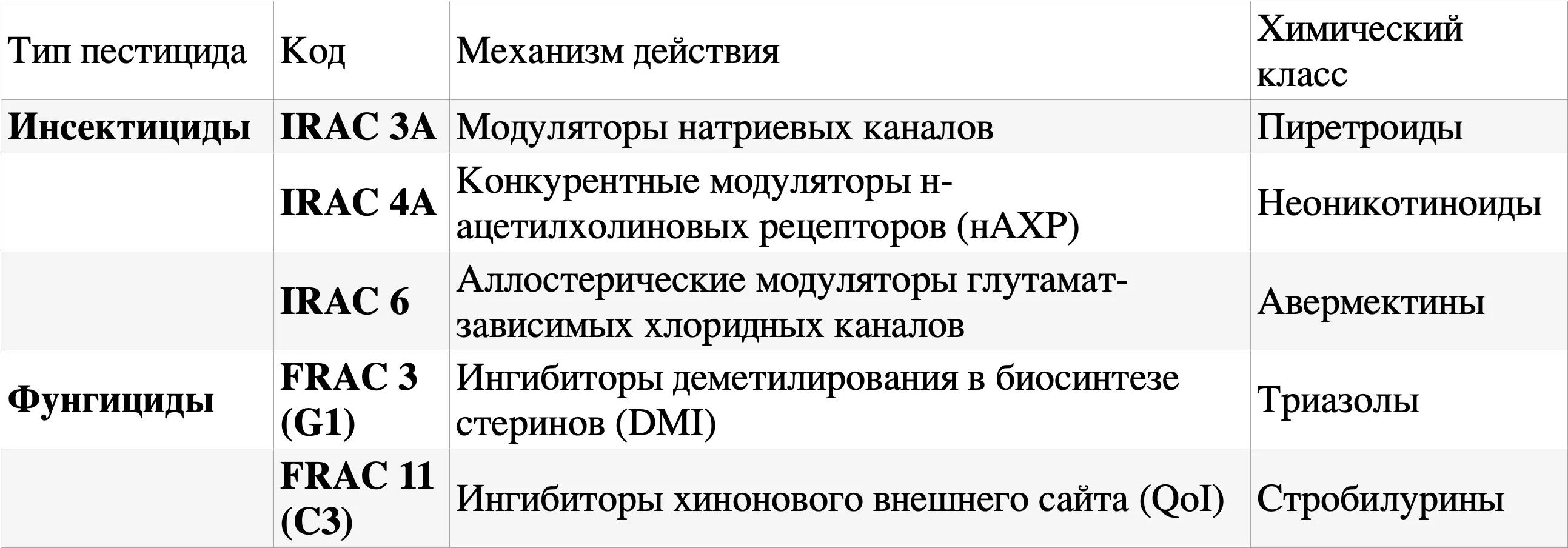Внимание: не путайте смену торгового названия препарата со сменой механизма действия. Два препарата с разными названиями могут содержать действующие вещества из одной и той же группы IRAC или FRAC и не подходят для чередования.