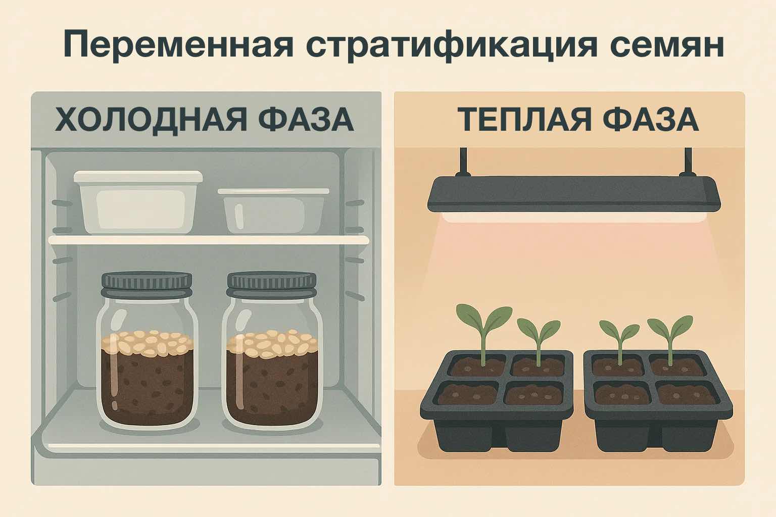 Переменная стратификация семян включает холодную фазу в условиях охлаждения, за которой следует теплая фаза под лампами для стимуляции прорастания семян.