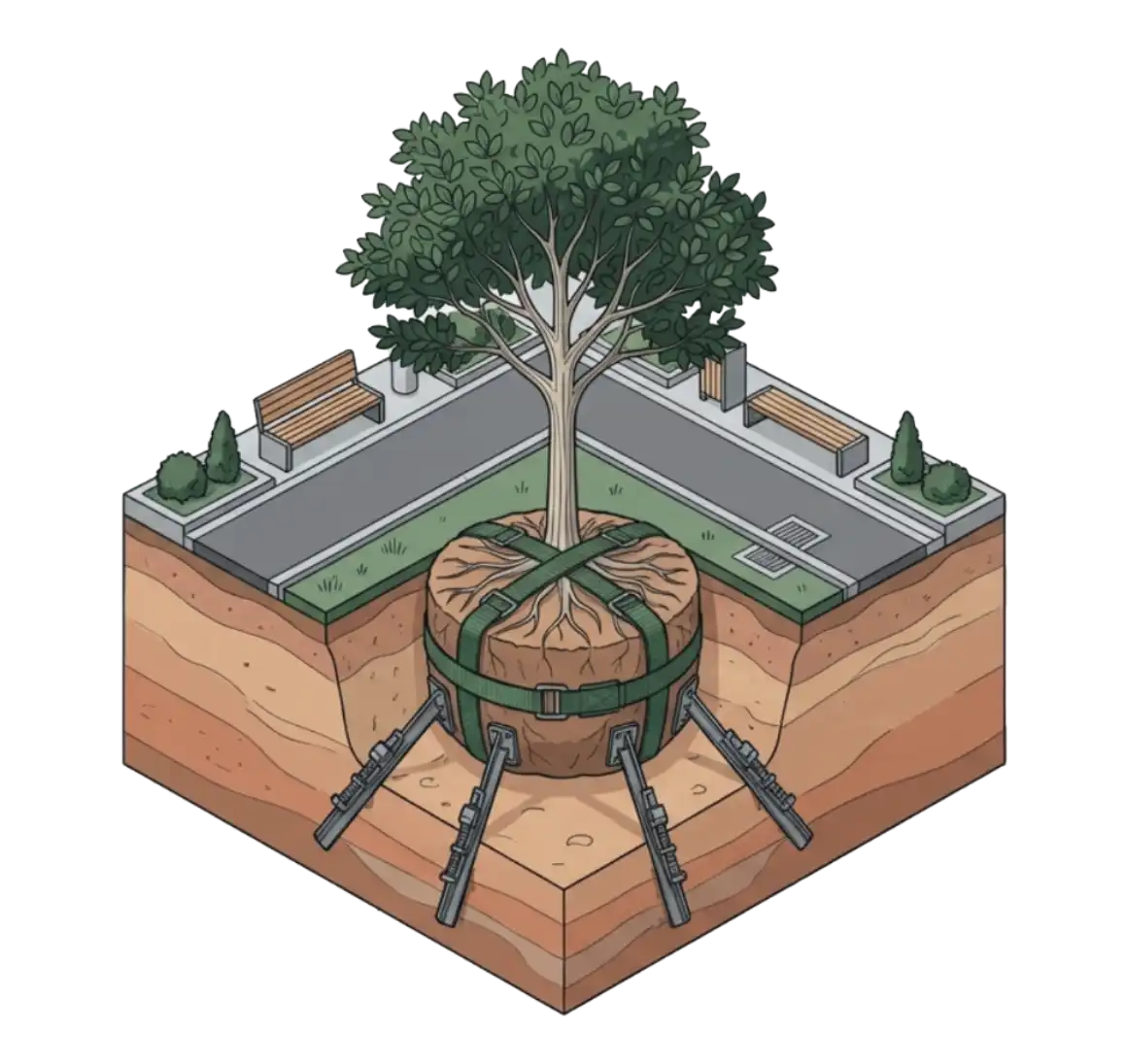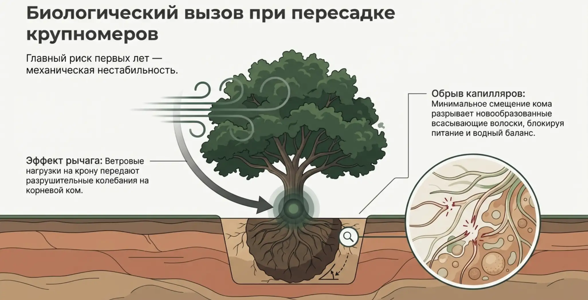 Процесс пересадки дерева, особенно крупномера, является серьезным биологическим стрессом. Основной риск в первые два-три года жизни растения на новом месте связан с механической нестабильностью. Под воздействием ветровых нагрузок ствол дерева работает как рычаг, передавая колебания на корневой ком. Даже минимальное смещение кома приводит к разрыву новообразованных всасывающих волосков - тончайших корней, ответственных за питание и водный баланс. Система скрытого крепления кома Tree Lock была создана как ответ на эту биологическую проблему, предлагая метод фиксации, который блокирует движение именно корневого кома, позволяя надземной части дерева сохранять естественную гибкость и развивать правильную конусность ствола.