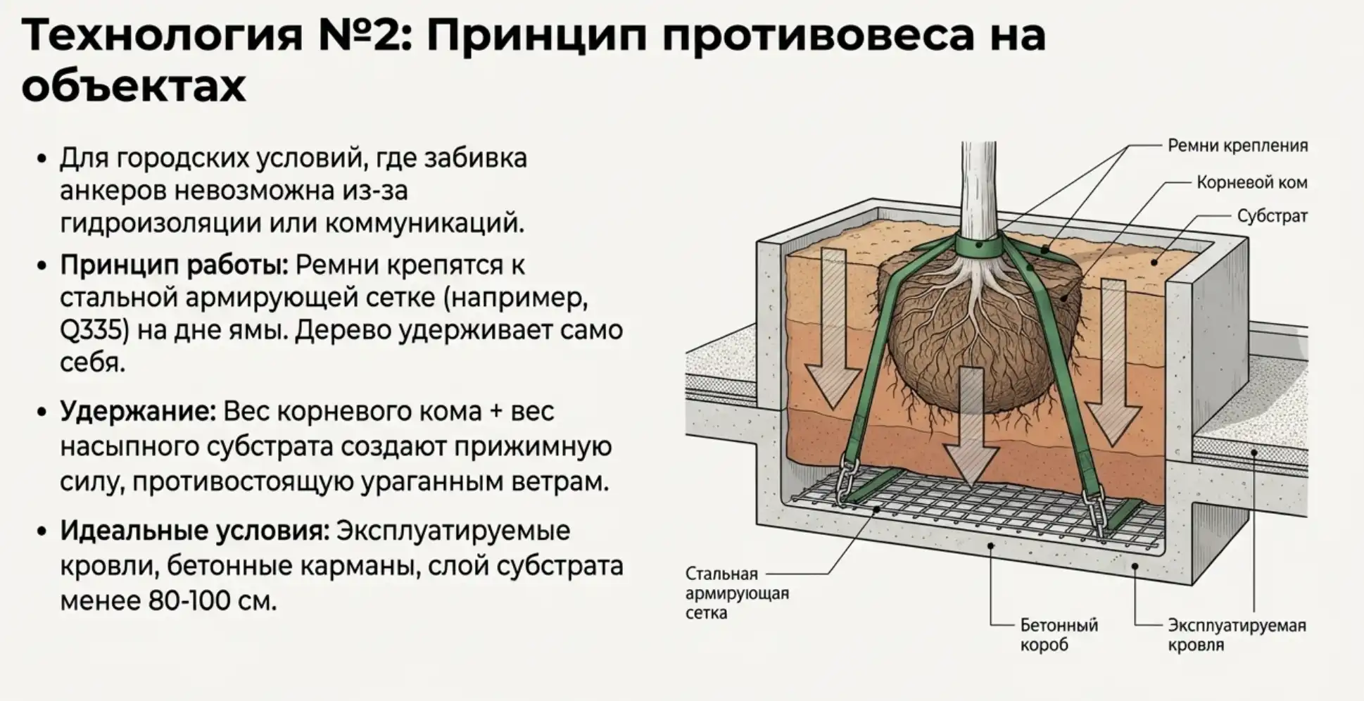 Вместо анкеров ремни системы крепятся к стальной армирующей сетке (например, типа Q335), уложенной на дно посадочной зоны. Здесь работает физика противовеса: дерево удерживает само себя. Вес корневого кома в сочетании с весом субстрата, насыпаемого поверх сетки, создает колоссальную прижимную силу, которая не дает дереву наклониться даже при ураганном ветре.