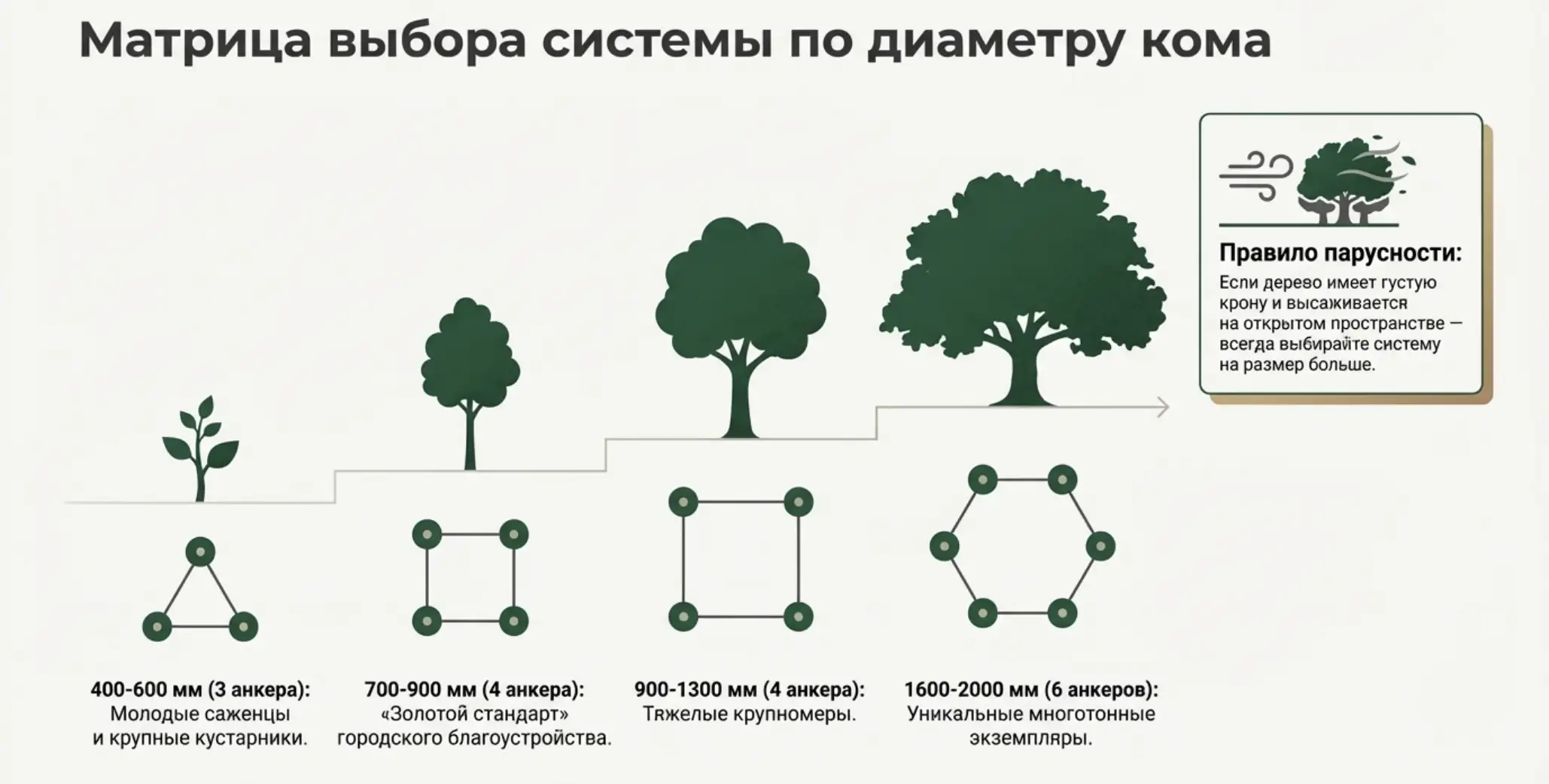 При выборе между двумя соседними категориями профессионалы рекомендуют ориентироваться на парусность кроны. Если дерево имеет густую, плотную крону и высаживается на открытом, продуваемом месте, следует всегда брать систему на один размер больше.