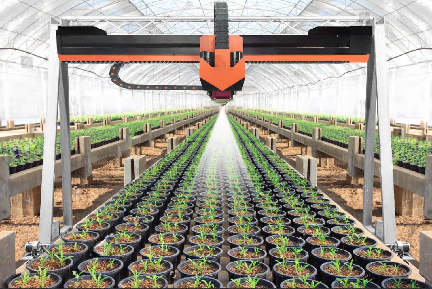 Сельскохозяйственный робот выполняет автоматизированный уход за растениями в большом питомнике горшечных роз.