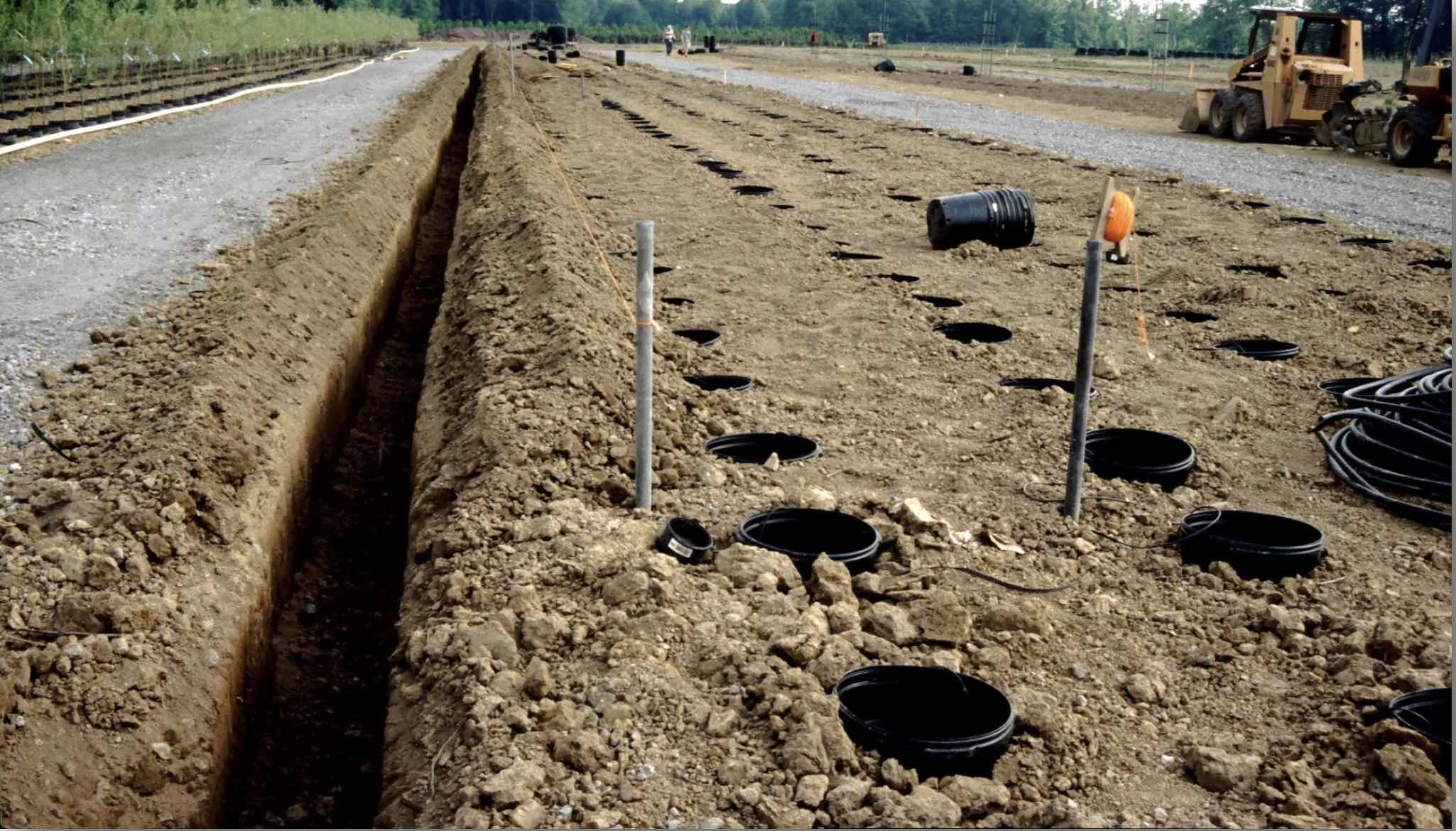 Самым важным фактором является дренаж почвы. Система PNP не рекомендуется на тяжелых, плохо дренируемых почвах. Поле не должно затопляться, даже редко. Если почва не является естественно песчаной или супесчаной, необходимо установить подповерхностную дренажную систему. Обычно это 10-сантиметровые гофрированные дренажные трубы, уложенные под каждым рядом сокет-контейнеров, примерно на 15–25 см ниже их дна.