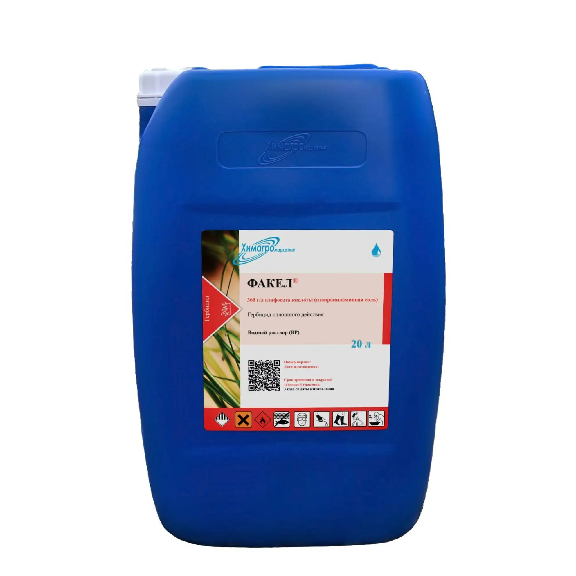Гербицид Факел – это водный раствор (ВР) на основе глифосата в форме изопропиламинной соли с концентрацией 360 г/л. Производит его компания Химагромаркетинг, и он относится к фосфорорганическим соединениям – производным глицина. Это системный и контактный гербицид сплошного действия, который еще может работать как десикант.