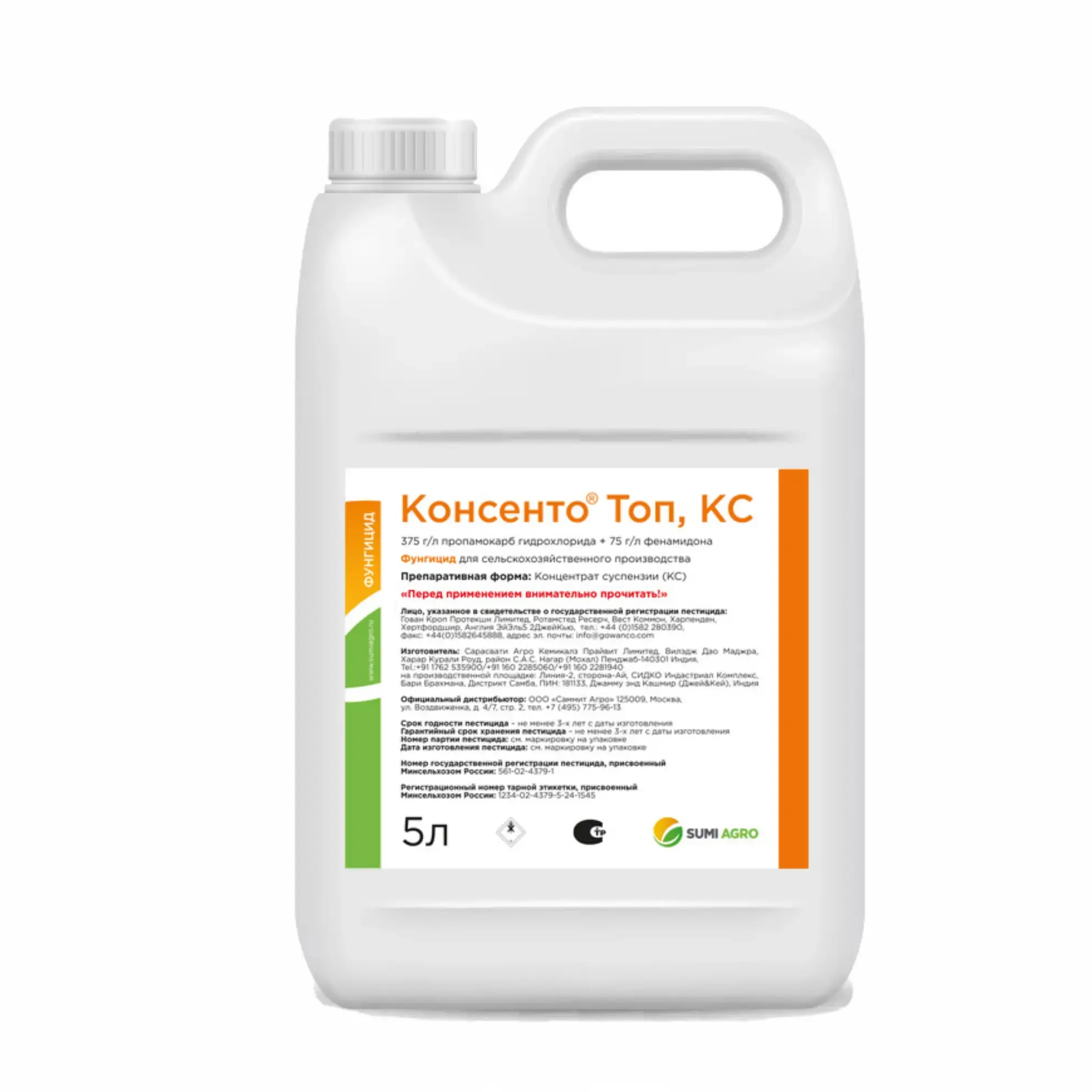 Фунгицид Консенто Топ — двухкомпонентный фунгицид системно-трансламинарного действия для профилактики и лечения фитофтороза и альтернариоза. Защищает новый прирост, листья и стебли, обладает выраженными антиспорулянтными свойствами и высокой дождеустойчивостью.