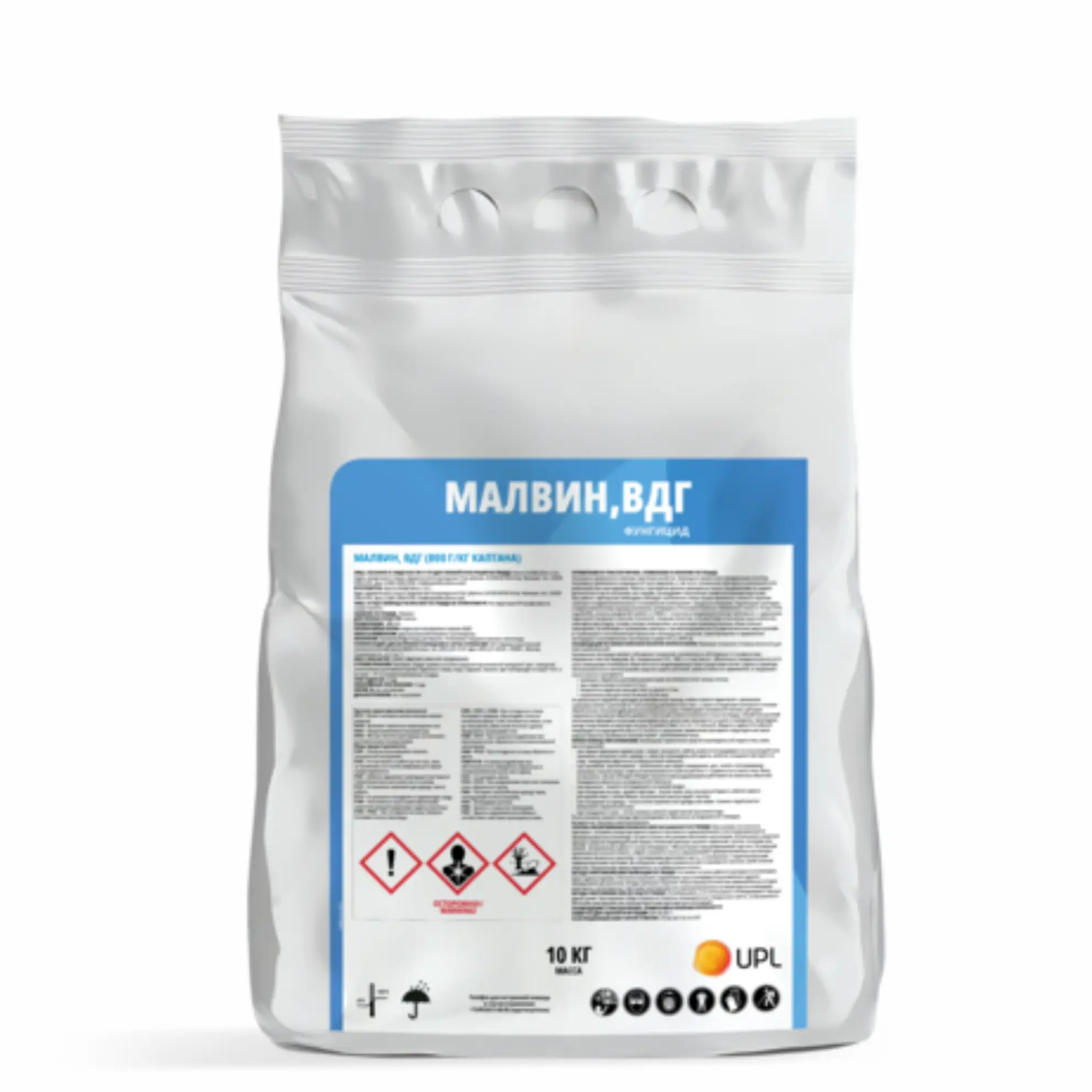 МАЛВИН, ВДГ — контактный фунгицид профилактического и раннелечебного действия для яблони и винограда. Формирует на поверхности листьев и плодов устойчивый защитный экран, препятствующий прорастанию спор и дальнейшему развитию инфекции. Эффективен в течение всей вегетации, оптимально работает при +15…+28 °C и соблюдении pH рабочего раствора 5,0–5,5.