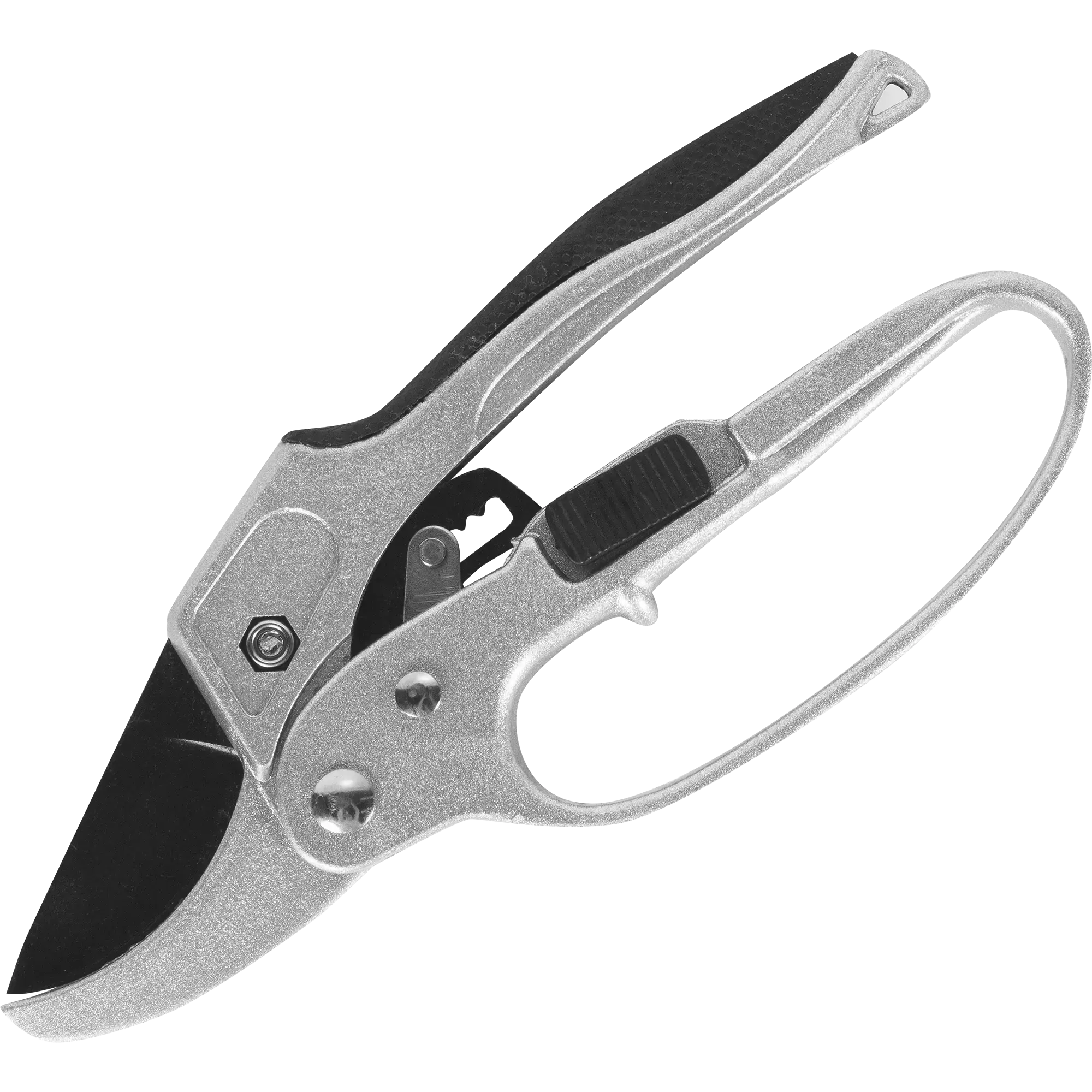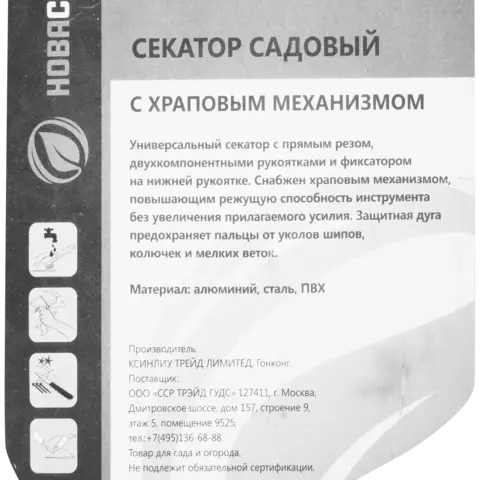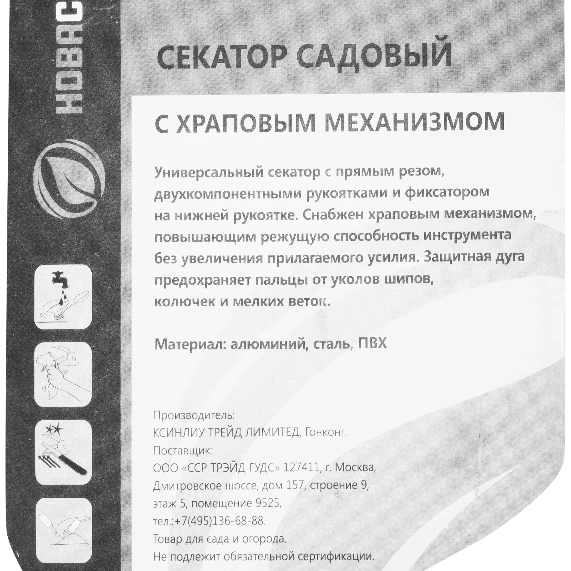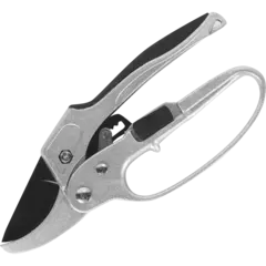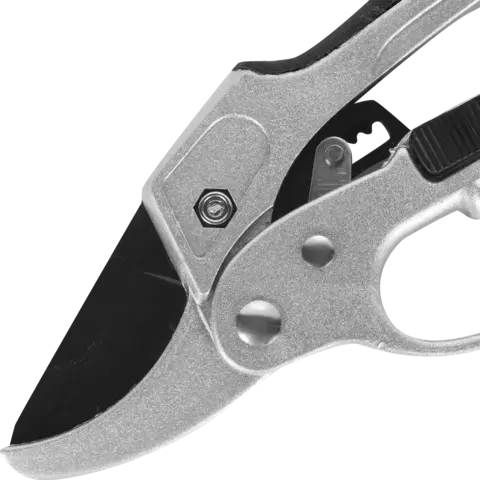 Секатор для вьющихся растений «Новасад» с алюминиевой ручкой изготовлен из прочного и легкого алюминиевого сплава. Инструмент имеет укороченные стальные лезвия и оснащен храповым механизмом, который облегчает нагрузку на руку при обрезке.